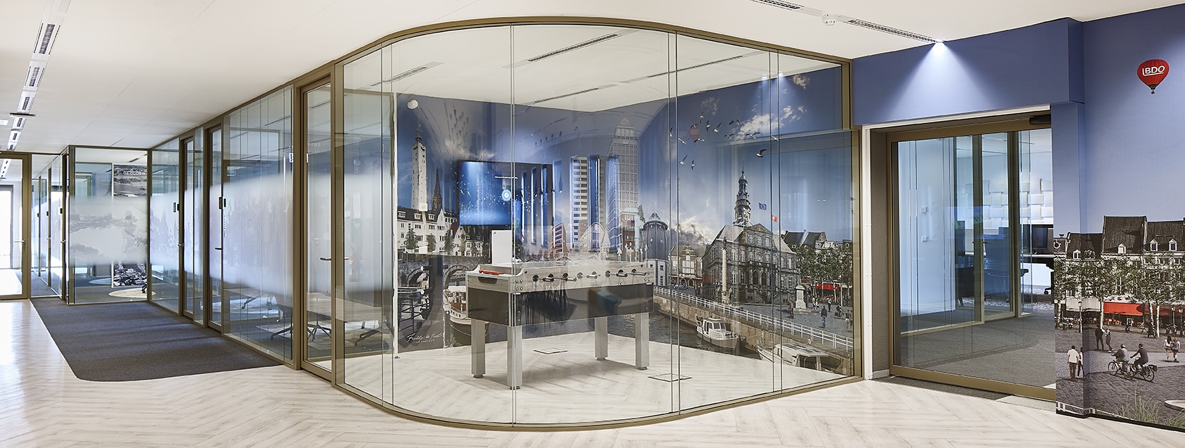 Leverbaar in enkel, dubbel of triple glas met akoestisch gelaagd glas. Optioneel met privacyfolies of gedeeltelijk gesloten panelen.